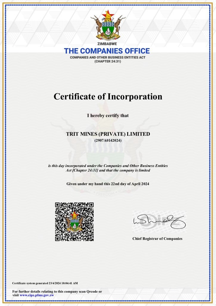 This certificate serves as official documentation of TRIT MINES (PRIVATE) LIMITED’s status as a registered entity in Zimbabwe, authorized to engage in lawful business activities as per the laws and regulations governing corporate entities in the country.